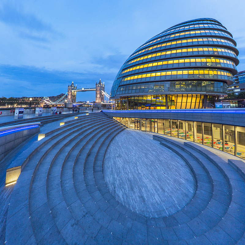 8) City Hall of London with the Tower Bridge in the Background.