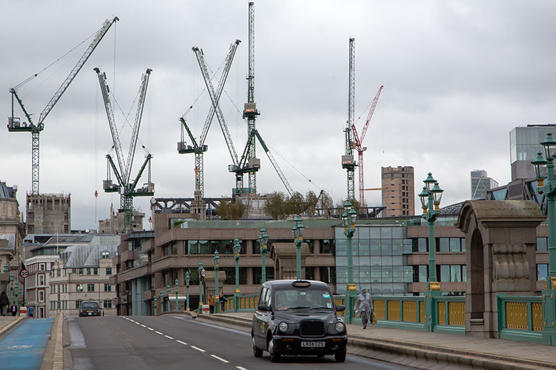 7) London building boom, many cranes along the skyline