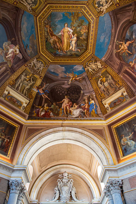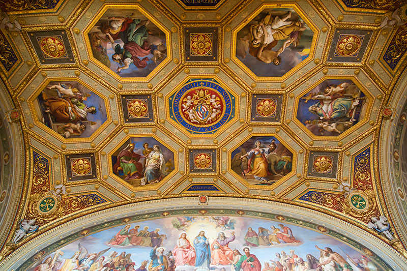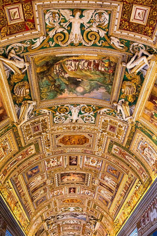Outside of the Basilica is the vast Vatican Museum with miles of display space. Every inch is decorated beyond imagination. Even the several gift shops have priceless, ornate ceilings. With no tripod and tooooo many people, all my photos are handheld and meager attempts to capture the beauty. Even the exit stairwell is a work of art. While most people’s heads are careened toward the ceiling, their feet are on exquisite mosaics and marble artwork. After hours of walking through the many rooms of the Vatican Museum, you enter the Sistine Chapel in awe. Those caught taking photos by the guards were required to delete them on the spot. Many people have dedicated their lives to Michelangelo and his work here and I know so little. I feel I would appreciate it more with more knowledge of the details. Just as happens with artists today, when his work was revealed it caused a great deal of controversy and criticism by critics. Painting angels without wings was one such topic of debate.